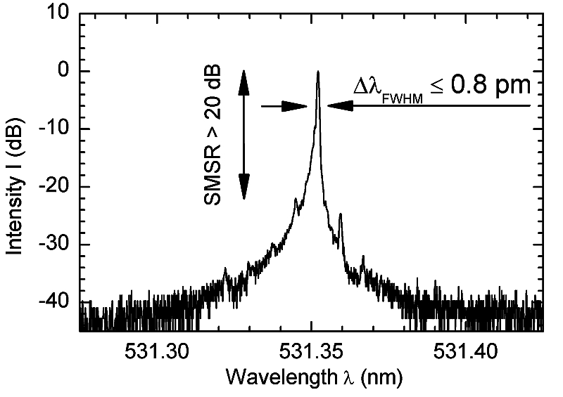 At the Ferdinand-Braun-Institut, frequency doubling of diode lasers in bulk crystals, planar waveguides and channel waveguides is systematically examined. In channel waveguides, a very high conversion efficiency of 40% can be reached, but this concept allows only moderate power levels in the range of 200 mW (Fig. 1 - blue triangles). Whereas in bulk crystals the situation is reversed and very high powers of 1.8 W are generated (Fig. 1 - yellow squares), however, at a relatively low conversion efficiency of 22%. Planar waveguides, in contrast, enable to generate high power levels in the Watt range and feature high conversion efficiencies. In a laboratory setup, an output power of 1.1 W at an opto-optical conversion efficiency of 26% was reached with this concept (Fig. 1 - green circles). A corresponding electro-optical conversion efficiency of 8.4% was measured. Hence, frequency doubling of diode lasers in planar waveguides is currently the solution of choice to realize compact visible diode laser modules with output powers of several Watt and an electro-optical conversion efficiency of more than 10%. Furthermore, the green light generated during the experiment feature a spectral linewidth of 0.8 pm full width at half maximum (FWHM) and a side mode suppression ratio (SMSR) of 20 dB (Fig. 2).