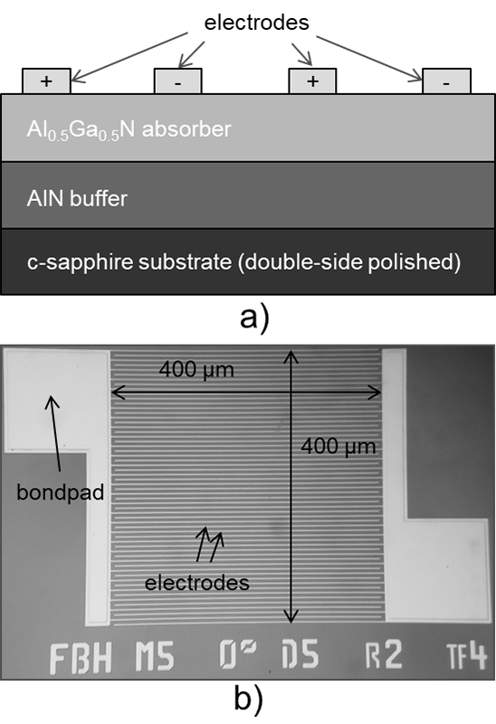 Fig. 1: Design of AlGaN MSM PDs: (a) cross-sectional sketch of layer design, (b) light microscopic plan-view image of processed MSM PD on (dark: semiconductor, bright: metal) [2]