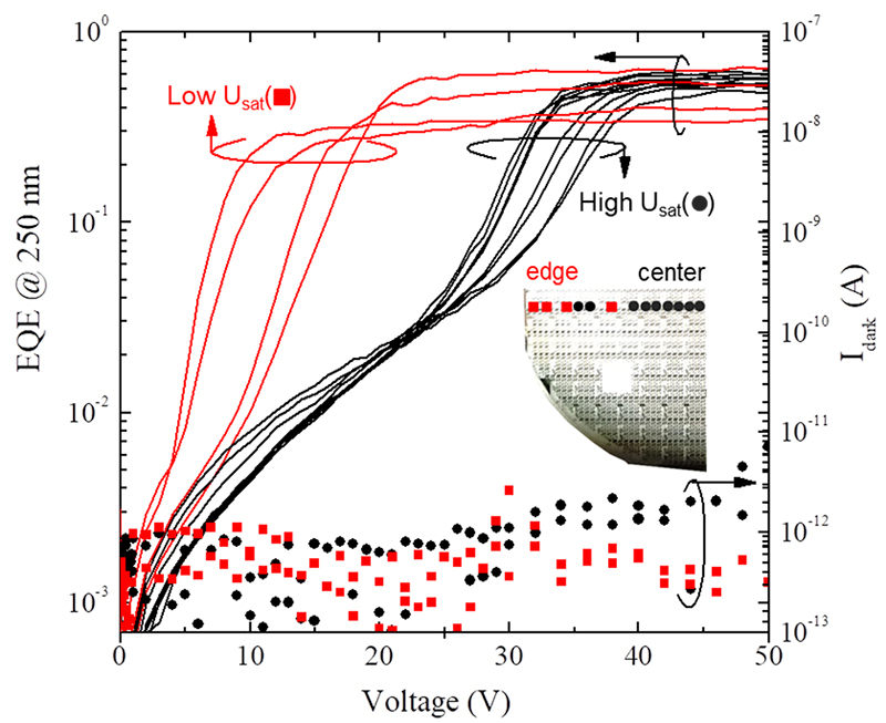 Fig. 2: EQE vs. bias characteristics of several MSM PDs illuminated from the bottom side at 250 nm wavelength along a 2-inch wafer from center (black) to edge (red). All devices show increasing EQE until saturation above Usat, while values of Usat vary between 10 V and 40 V. Dark currents Idark for all devices are low (exemplarily shown for one MSM PD with high and one with low Usat) [2]