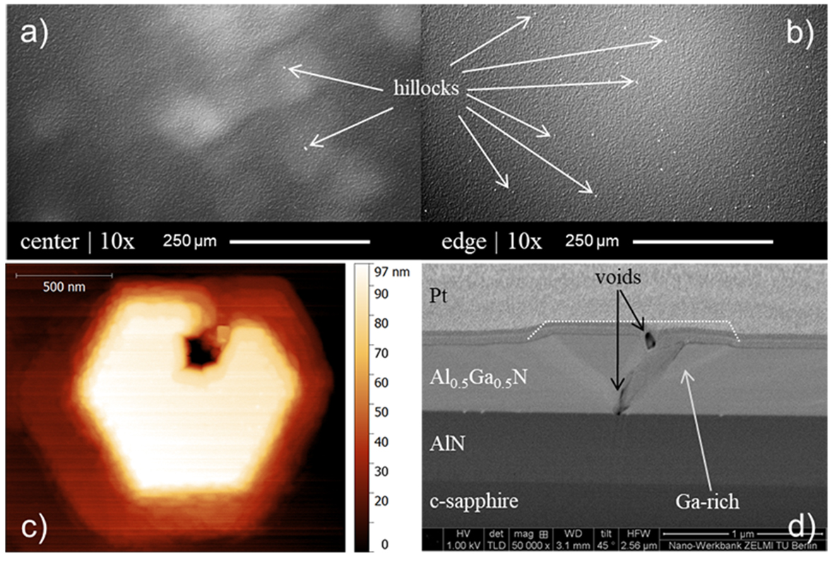 Fig. 3: Images of the Al0.5Ga0.5N surface by optical microscope (10x magnification) with Nomarski contrast (a) at center, (b) at edge of the 2-inch wafer. Density of hillocks (bright dots): 9 ∙ 102 cm-2 (center) and 1 ∙ 104 cm-2 (edge). (c) AFM topogram of typical hillock with hole in top facet, (d) SEM image of FIB cross section through defect shown in (c) [2]