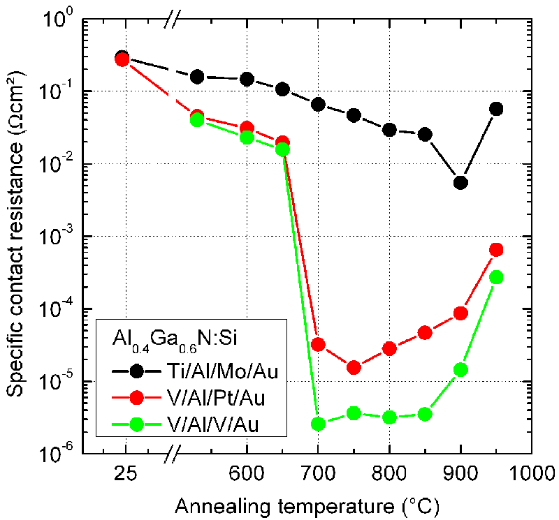 Fig. 1: Specific contact resistance of various contact systems on n-Al0.4Ga0.6N:Si in dependence on the annealing temperature.