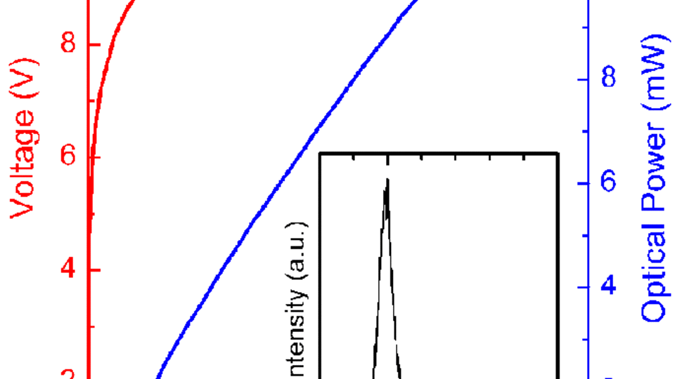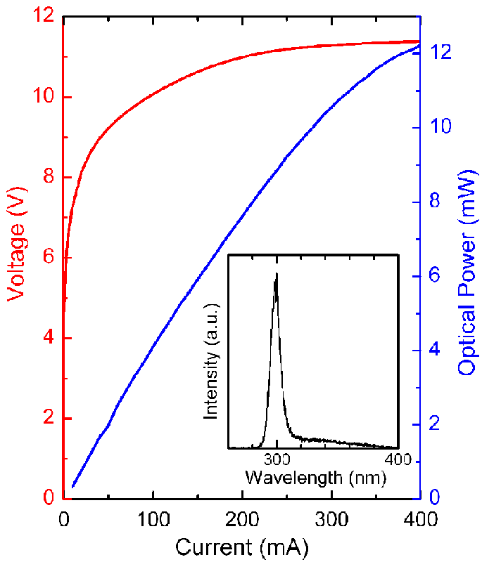 Characteristics and spectrum of an UV-B LED with optimized chip processing and mounting technology are shown in Fig. 3. The emission power thermally only rolls over at currents beyond 400 mA resulting in a light output power larger than 12 mW. The spectrum shows a dominant peak at a wavelength of 299 nm and only a weak emission in the UV-A range. Currently, we are studying the degradation of these LEDs under constant current operation and working on reducing the emission wavelength in the UV-C range.