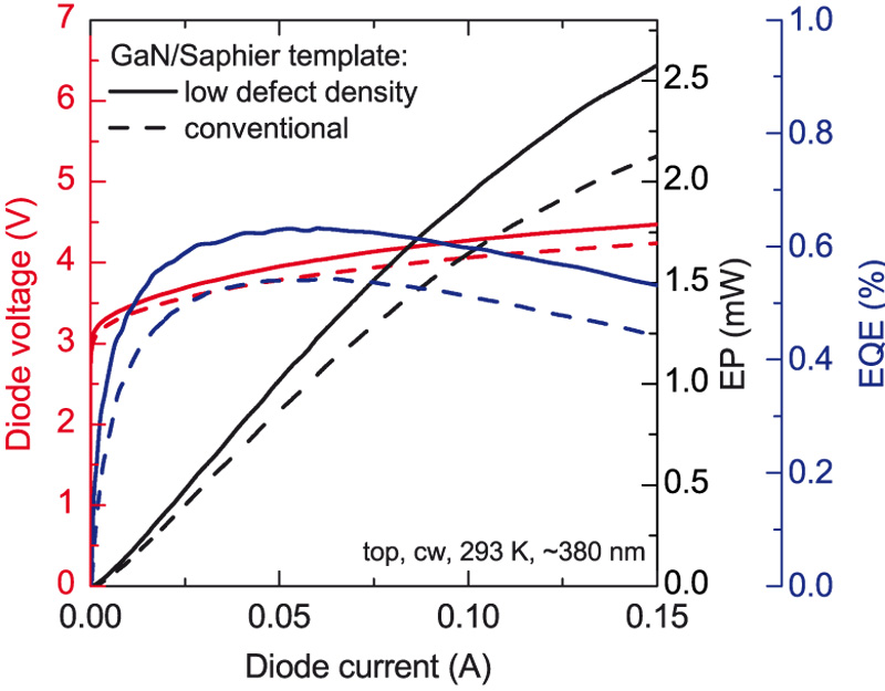 Furthermore, GaN-based devices on sapphire substrate suffer from the high number of dislocations threading from the GaN/substrate interface to the active region. By applying a defect reducing GaN buffer growth technique, the threading dislocation density in the active region could be reduced from 109 cm-2 to 3x108 cm-2. Thus, the recombination efficiency of the quantum wells could be increased. Fig. 2 shows the characteristics of identical LED heterostructures on a conventional GaN/sapphire template compared to a template with reduced defect density. By combining the optimizations it was possible to increase the external quantum efficiency of an LED structure emitting at 380 nm by more than a factor of two. In a next step, it is planned to shift the emission wavelength of the optimized heterostructure toward 360 nm, which is required for sensor applications.