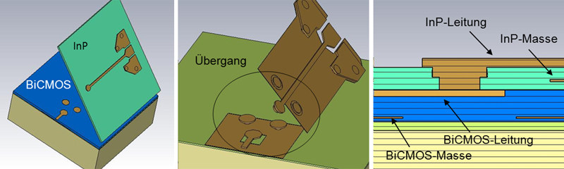 This is the reason why FBH and IHP in Frankfurt/Oder are developing an heterogeneous integration process combining InP-HBT and BiCMOS circuits on the same wafer. Among others, the advantage of this process is that the common integration enables to scale down the dimensions of the interconnects between the circuits. Consequently, their bandwidth capabilities are increased. The vertical distances between the BiCMOS and the InP circuits shrink to 8…10 µm. In order to fully exploit this potential for the interconnect performance it is first of all necessary to define geometry and material configuration in a way such that compatibility with both CMOS and InP technology is fulfilled (see Fig. 1). Secondly, the vias, the metal pattern, and the ground metallization need to be designed by means of 3D em simulation to optimize the high-frequency behavior.