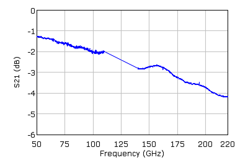 These efforts now proved to be quite successful: We could demonstrate broadband function up to 220 GHz. Fig. 2 presents measurement results for a back-to-back test structure, which includes a 1250 µm long transmission line in the BiCMOS part and two interconnects to the InP layer with on-wafer probing pads. The insertion loss of the entire structure includes loss contributions from the BiCMOS lines, the pads, and the interconnects themselves. In practice, the insertion loss of the transitions turns out to be very small so that it is hardly visible in the overall loss. A conservative estimation yields an upper level for the insertion loss per interconnect of 0.5 dB at 100 GHz and 1 dB at 220 GHz. This is achieved together with excellent broadband properties over the full frequency range.