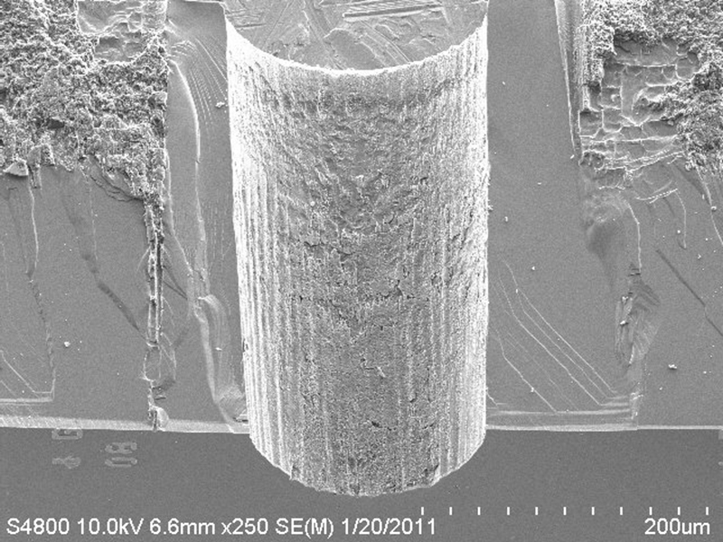 High-power devices based on the AlGaN/GaN material system are usually fabricated on silicon carbide (SiC). The formation of VIAs, however, is very demanding and time-consuming due to the mechanical hardness and chemical inertness of the SiC substrate material. Dry chemical etching of holes requires mechanical thinning to about 100 µm. Etching of VIAs through thicker SiC is not possible to date. At FBH, a laser-assisted VIA process has been developed that allows the institute the formation of electrical through contacts from the front to the backside of the device on 350 - 400 µm thick SiC. The patented technology was developed already some years ago [PAT] and has recently been optimized for power electronics applications that require larger VIAs with diameters from 150 to 200 µm.