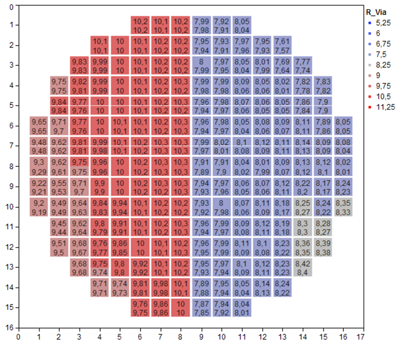 Fig. 1 depicts the process flow. Laser processing is carried out at the wafer’s backside. A solid-state laser with a wavelength of 355 nm providing 4.5 W average output power at 25 kHz pulse repetition rate and a pulse length of < 30 ns is used for laser drilling of through holes. The laser is integrated in a commercial laser workstation (ILS 500 Air) that features a positioning accuracy of the laser beam of ± 1 µm on the wafer’s backside to precisely drill the hole through front contact pads. The laser beam has a diameter of about 15 µm and is appropriately moved across the wafer’s back surface to obtain the desired hole diameters. Thus, it is possible to drill holes with different diameters that can easily be adjusted to needs of the devices or mounting requirements (Fig. 2). Depending on the diameter, the drilling time is about 3 - 5 s per hole. The electrical interconnect is formed by a 5 µm thick gold layer that is deposited onto the wall of the VIA hole. The electrical resistance of a single VIA can be determined from the Ohmic current-voltage behavior. Fig. 3 shows a representative mapping of resistance values of VIAs through 380 µm thick SiC. On the left side of the test sample VIAs with 150 µm diameter were formed, on the right side the VIAs have a diameter of 200 µm. Due to the smaller surface of the wall, the resistance through the 150 µm VIAs is 10 mΩ compared to 8 mΩ obtained from the 200 µm VIAs. The newly optimized process for these larger VIAs will soon be applied to AlGaN/GaN power transistors.