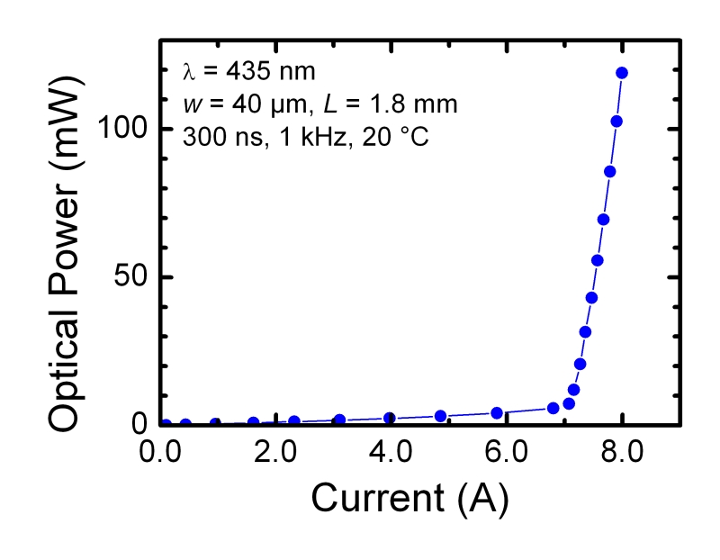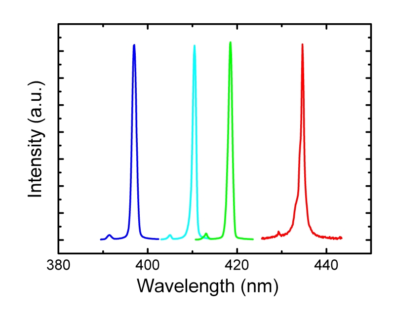 After successfully optimizing these device details, FBH recently succeeded in realizing laser diodes with emission wavelengths in the blue spectral range > 430 nm. Fig. 1 shows the characteristics of a broad area laser diode in pulsed operation. The FBH thus features the technology to fabricate laser diodes in the wavelength range from 397 to 436 nm (compare Fig. 2). The current work focuses on ridge waveguide laser structures which should allow for a continuous-wave operation of the laser diodes in this spectral range.