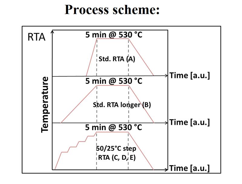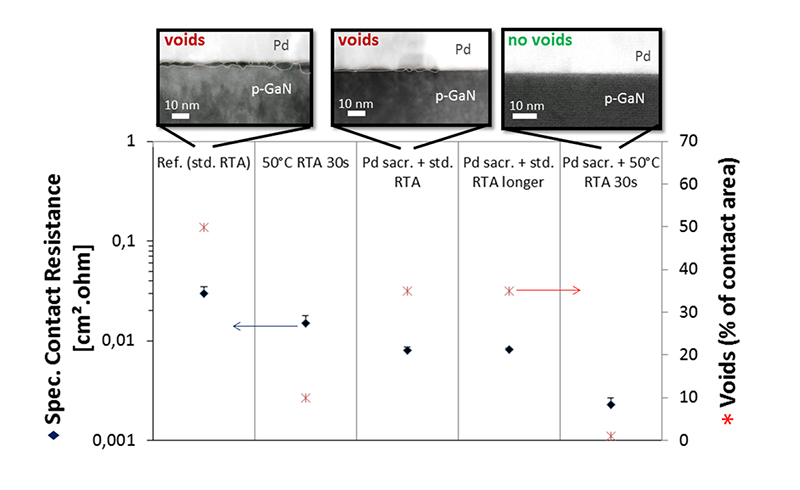STEM images and TLM analysis (Fig. 1) from all samples show that the area of the voids at the metal/p-GaN interface is reduced by applying a step-wise heating of the sample (process D). This significantly reduces the specific contact resistance (by TLM) of the Pd/p-GaN contact.