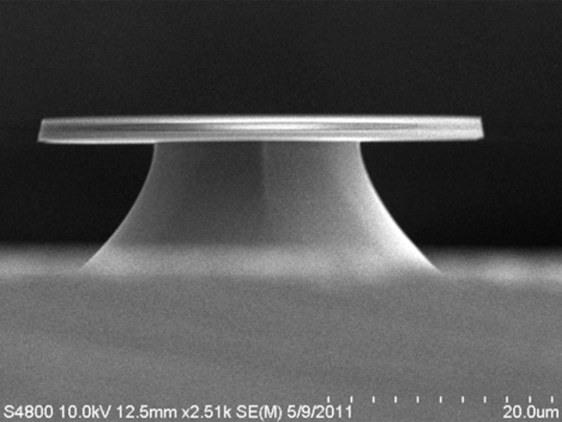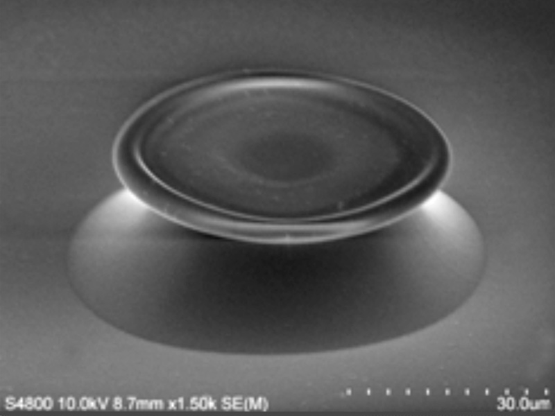 Micro resonators are often disks or tori (see pictures) with a typical diameter of around 100 µm and a thickness of only several micrometers. These structures often consist of silicon dioxide (SiO2) and can store light by means of total internal reflection. The resonators are fabricated from silicon wafers coated with a thin SiO2 layer using photolithography and etch processes. First of all, the oxide is structured and the underlying silicon is then removed selectively. As the oxide layer is not affected by the second step, a thin disk of silicon dioxide forms that is resting on a stem of silicon. At FBH, a set of process parameters was determined that allows to produce the "mushroom-like structures" shown in fig. 1. Fig. 2 depicts a micro toroid produced from a disk by means of subsequent CO2 laser reflow.