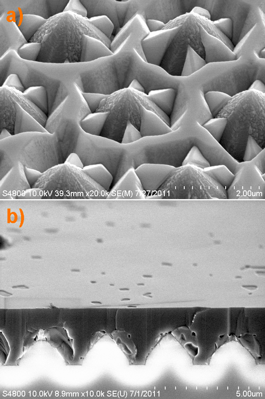 Fig. 1: Top view SEM pictures of (0001) GaN grown on CPSS after 20 min growth time (a), side view after 90 min (b).