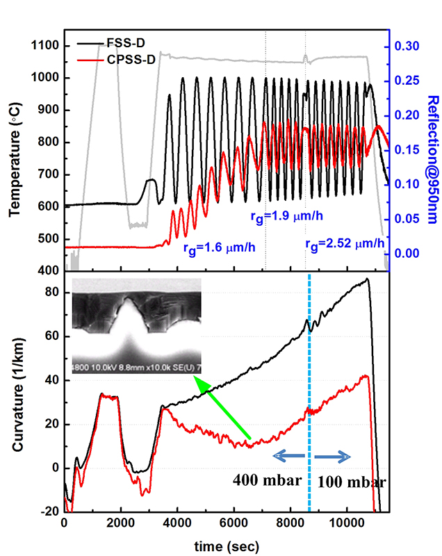 Distinct differences in stress development are apparent from the in-situ measured wafer curvature (Fig. 2). In spite of the typical tensile strain during growth of (0001) GaN on non-patterned sapphire, initial compressive stress is found when the lateral coalescence time is delayed on PSS. From the curvature measurement, the average compressive stress during (0001)-GaN layer growth on CPSS before coalescence is determined to be around 0.2 GPa. Subsequently, tensile stress comparable to growth on FSS builds up as soon as the surface is closed (Fig. 2, arrow). As a consequence, wafer curvature and in-plane residual stress can be controlled by changing the GaN coalescence speed depending on growth conditions and PSS properties.