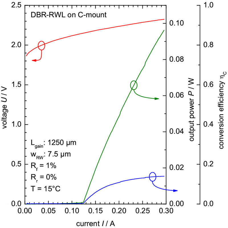 Fig. 1: Voltage, output power, and efficiency as a function of driving current of a DBR-RWL emitting at 635.3 nm.