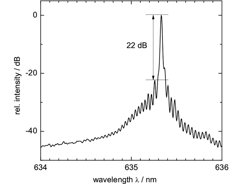 First results turned out very promising: The new DBR-RWLs emit up to almost 100 mW optical output power in the wavelength range between 630 nm and 640 nm (Fig. 1). A grating period of 972 nm, for example, resulted in an emission of 635.35 nm (Fig. 2). The emission is spectrally narrow with less than 9 pm bandwidth and a side mode suppression ratio in excess of 18 dB. With customized coating a small linewidth necessary for high precision metrology and a higher side mode suppression ratio was achieved. A very simple and, at the same time, fast wavelength tuning can be performed by current modulation. Research on tapered laser structures with such monolithic integrated Bragg reflectors will lead to an output power above 100 mW with narrow spectral bandwidth in future.