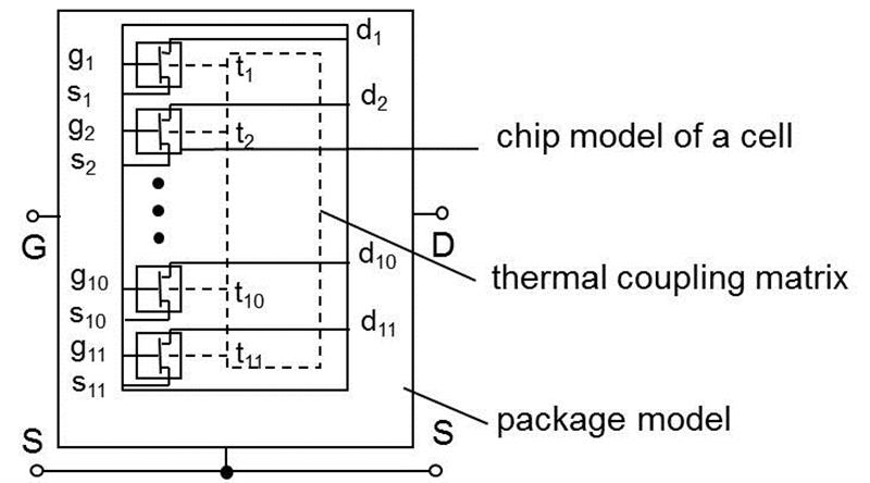 The bar model consists of a package model, a network describing the thermal properties and coupling of the cells, and the chip models of the power cells (Fig. 2). The package model is based on electro-magnetic simulations, while the thermal model is derived from FEM (finite elements method) calculations of the power bar structure. Each cell of the power bar is represented by a non-linear large-signal transistor model. This combination of transistor description, package model, and the full thermal representation including coupling between the transistor cells is a novel approach.
