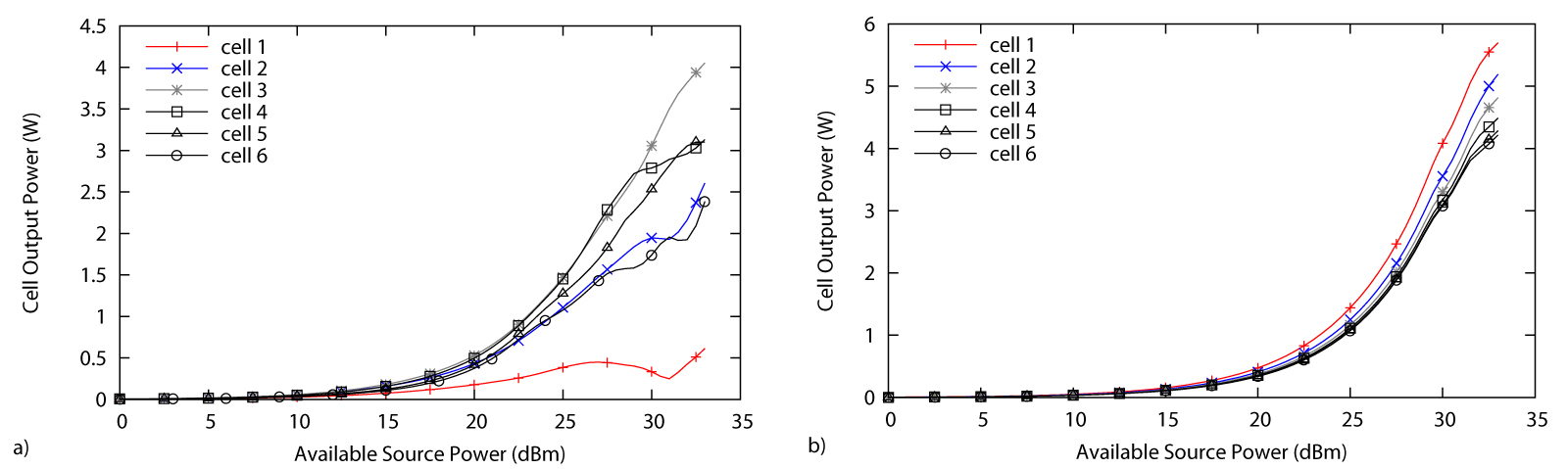 As an example, Fig. 3 shows the RF output power of the individual cells with increasing total RF input power of the bar. Cell 1 is located at the end of the bar, cell 6 in the middle (see Figs. 1 and 2). If the cells are connected in the standard way, the cells of the power bar deliver very different output powers (see Fig. 3a). Internal oscillations between the cells drastically reduce the overall gain of the bar. Introducing ohmic resistances between the cells the oscillations between the cells are suppressed and the power is distributed now much more evenly (Fig. 3b). As a result, total output power and efficiency of the bar almost double.