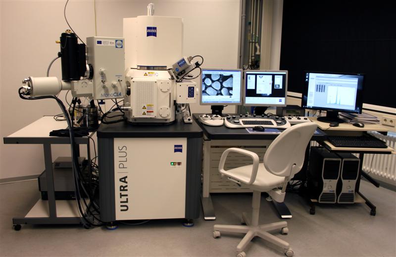 The SEM is equipped with several systems for the analysis of structural and optical properties of semiconductor layers and devices. Among these is an energy-dispersive X-ray spectrometer (EDXS) from Bruker Nano with an energy resolution of 125 eV for quantitative determination of composition of compound materials as well as a system for detection of electron-induced currents (EBIC) allowing for failure analysis of transistors and semiconductor laser diodes.