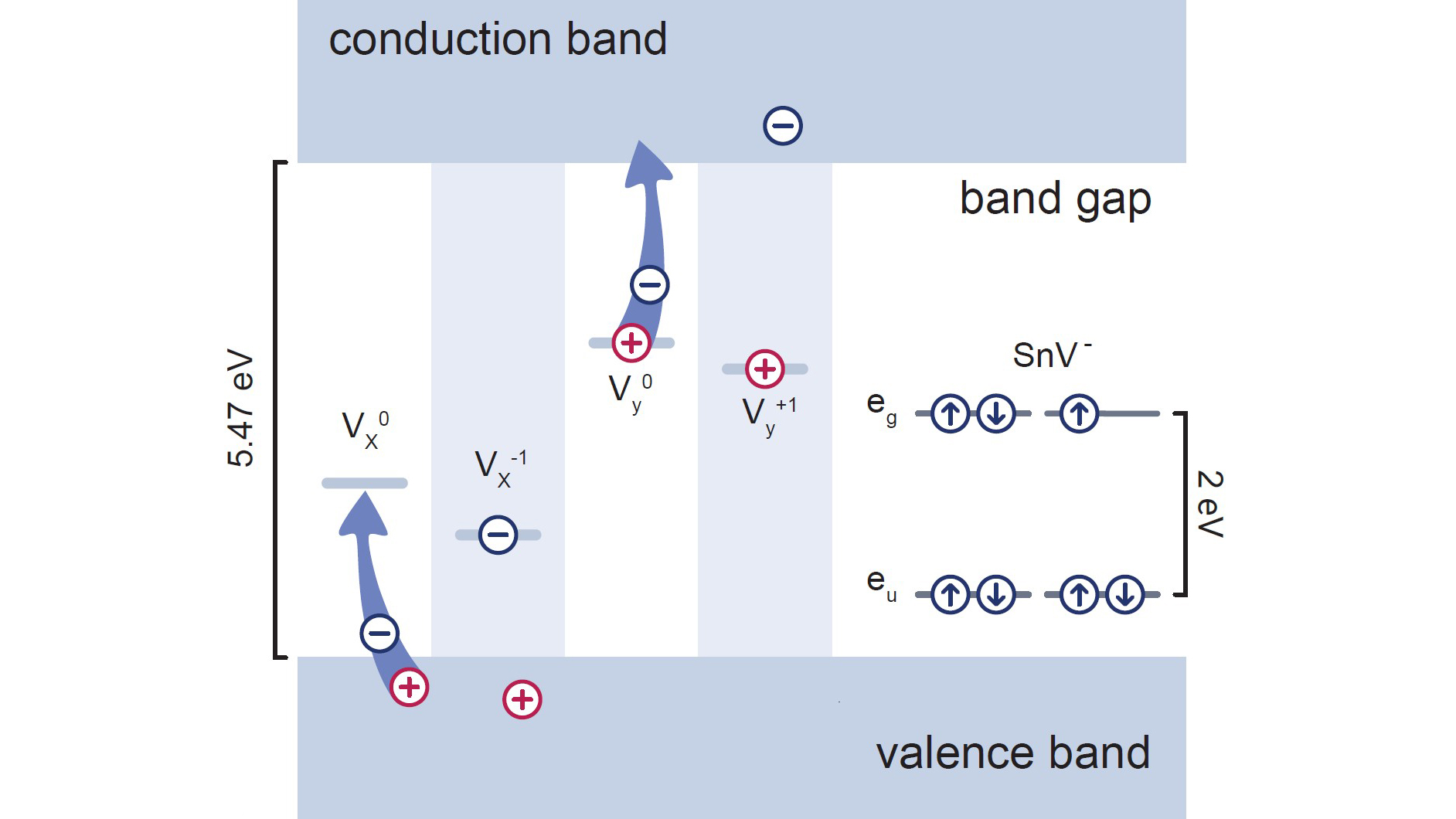 Fig. 3: Illustration of the charge dynamics of the SnV, the neutral (Vᵢ⁰) and the ionized (Vᵢ⁺¹ / Vᵢ⁻¹) defects within the diamond bandgap. The V defects act as charge traps that can capture and release electrons. Each of these processes alters the signal collected from the SnV sensor, enabling the study of charge dynamics at the single defect level.