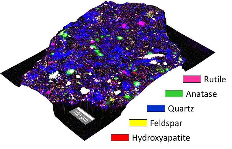 To this end, confocal Raman microscopy measurements were performed in conjunction with our SERDS experiments to generate a better understanding of soil properties, e.g. the heterogeneous distribution of target substances. As the investigated area for each measured point is about 1 µm2, spatially resolved Raman spectra of individual soil constituents can be obtained. Fig. 1 shows a 3D false-color Raman image of the sample surface. Contributions of rutile, anatase, quartz, feldspar and our target analyte hydroxyapatite can be seen.