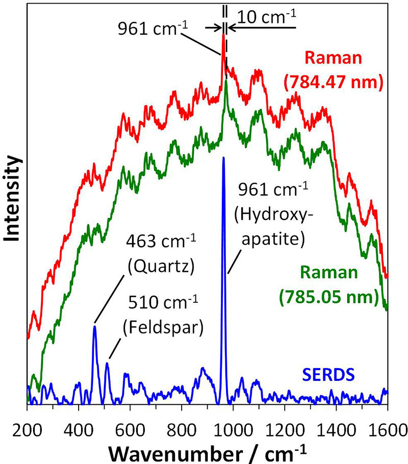 For our SERDS investigations, the sample was initially excited at the first laser wavelength (784.47 nm) of the dual-wavelength diode laser [2], and the Raman spectrum was recorded (red curve in Fig. 2). Here, a larger excitation spot size (diameter approx. 20 µm) was applied with respect to future field applications of portable Raman systems to obtain spectroscopic information from a larger, i.e. more representative area of the sample. The larger spot size also causes pronounced fluorescence interference and only one single Raman signal at 961 cm-1 is visible in this case. Subsequently, the sample was excited at the second laser wavelength (785.05 nm), the corresponding Raman spectrum is shown as green curve in Fig. 2. The spectrally narrow Raman signals shift with the shift in excitation wavelength, i.e. 10 cm-1, while the spectrally broad fluorescence remains unchanged. A subtraction of both spectra (and further mathematical processing) can therefore effectively separate the Raman signals from fluorescence interference as shown in the blue curve in Fig. 2. Due to the larger excitation spot size contributions from three individual soil components can be identified in the SERDS spectrum: quartz, feldspar and hydroxyapatite. These results highlight the large potential of SERDS as a promising tool for soil analysis in precision agriculture to improve soil nutrient management [3].