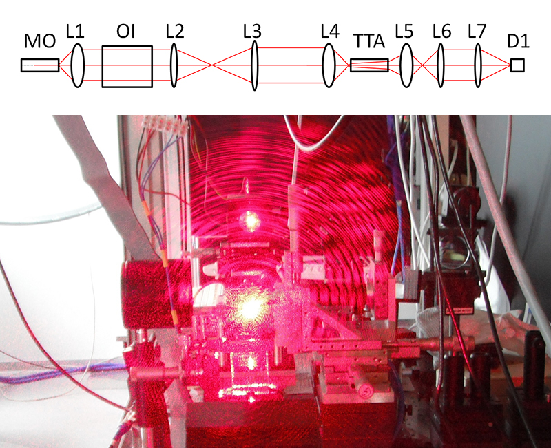 Fig. 1: top: Sketch of the beam propagating through various optics, bottom: MOPA experiment with the camera hovering above the detector D1