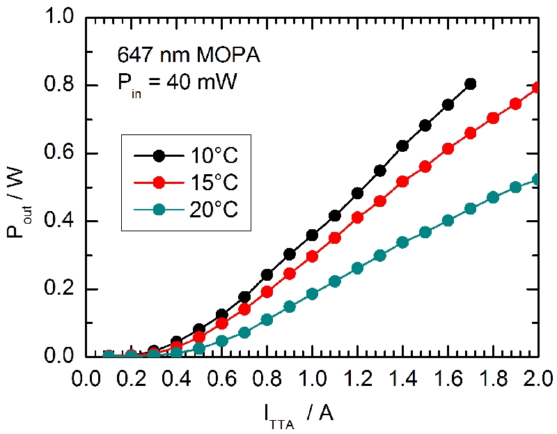 The amplifier chips used for the master-oscillator power-amplifier (MOPA) experiment featured a tapered contact stripe with a width of 30 µm at the input and 100 µm at the output facet (TTA). In order to suitably guide the laser beam through the amplifier a set of four lenses was used in front of and another two behind the TTA chip (see Fig. 1). This allows directing the horizontal focus outside the amplifier chips, which greatly improves the damage threshold of the device. The optical power behind the TTA is shown in Fig. 2 as a function of the input current for three different temperatures. From this graph it is easily discernable that a high output power requires sufficient cooling and that output powers in excess of 500 mW can be reached.