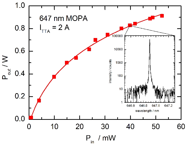 G. Blume, J. Pohl, D. Feise, M. Jendrzejewski, M. Greiner, P. Ressel, K. Paschke, "Single-mode master-oscillator power amplifier at 647 nm with more than 500 mW output power", Opt. Lett., vol. 40, no. 8, pp. 1757-1759 (2015).
