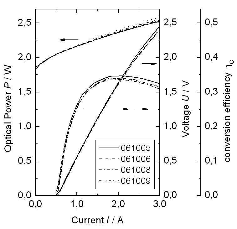 FBH develops red broad area laser diodes (100 µm x 1,5 mm) with a GaInP quantum well, an AlInP n-cladding and an Al0.85Ga0.15As p-cladding layer. These devices show an output power of 2.5 W and a conversion efficiency of 35% at 15°C. AlGaAs can be doped with carbon to a very high level. While the doping of AlGaInP with zinc, limits the doping level to 5 x 1017 cm-3, the doping with magnesium leads to memory effects. Additionally, Al0.85Ga0.15As has not only a lower electrical resistance but also a lower thermal resistance. By mounting the device p-side down on CVD-diamond with AuSn solder, a thermal resistance of only 5 K/W is obtained.
