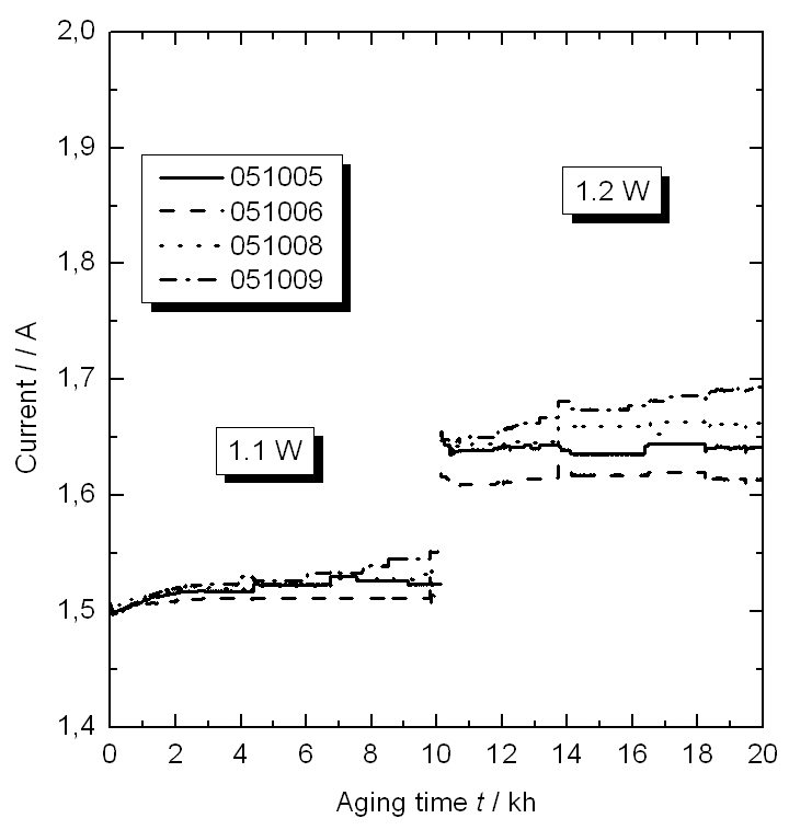 Reliability tests were carried out at an output power of up to 1.2 W for in total 20 000 h revealing a degradation rate of at most 3x10-6 h-1. Based on this measurements, a lower limit of the mean time to failure of 87.000 h at 1.2 W can be extrapolated. This exceeds all previously published values.
