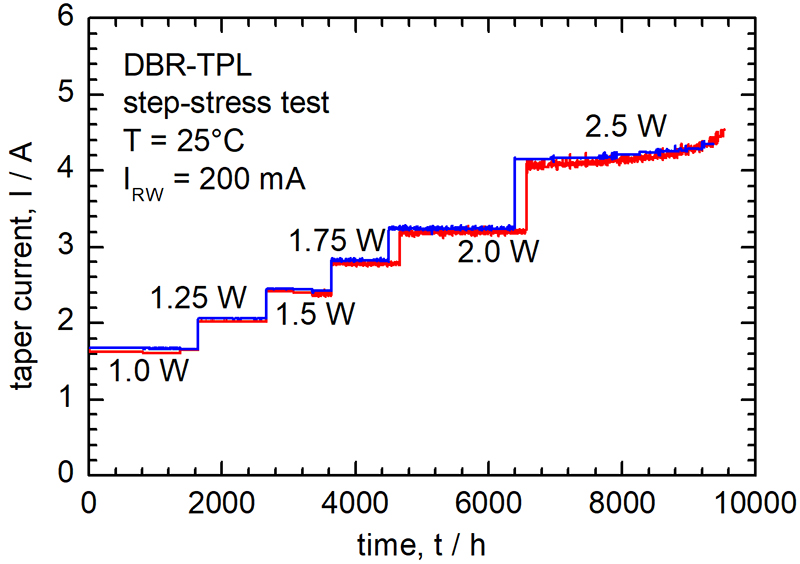 At the previously demonstrated power level of 1 W the improved lasers show no degradation. Thus, a constant power step-stress test was performed to estimate the reliability of the new design. The optical output power was then successively increased to 2.5 W, before degradation behavior became visible (see Fig. 3). This result demonstrates that stable operation of 2 W to 2.5 W can be maintained for more than 5,000 h.
