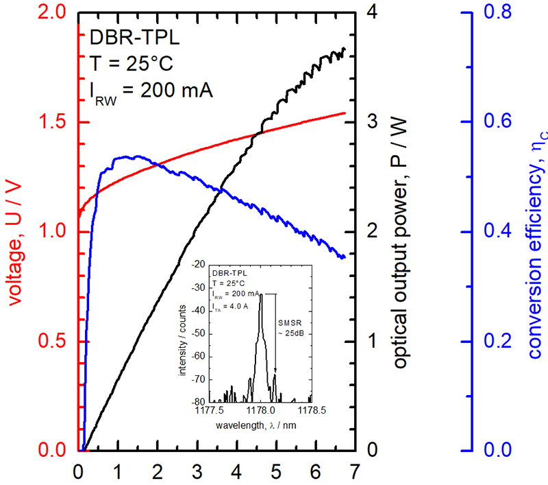 The power current characteristics up to a taper current of 7 A are shown in Fig. 2. The threshold current was less than 150 mA and the slope efficiency around 0.7 W/A. The low series resistance of less than 100 mOhm resulted in a record conversion efficiency of more than 45% at 2.5 W output power. The spectrum at 2.5 W shows a single peak at 1178.0 nm with a side-mode suppression of more than 30 dB.