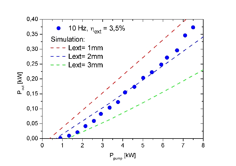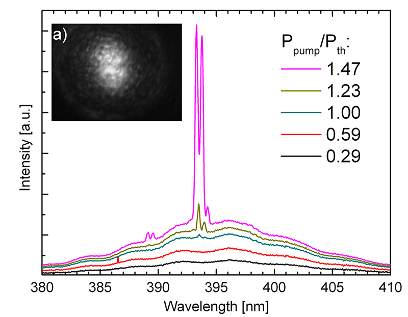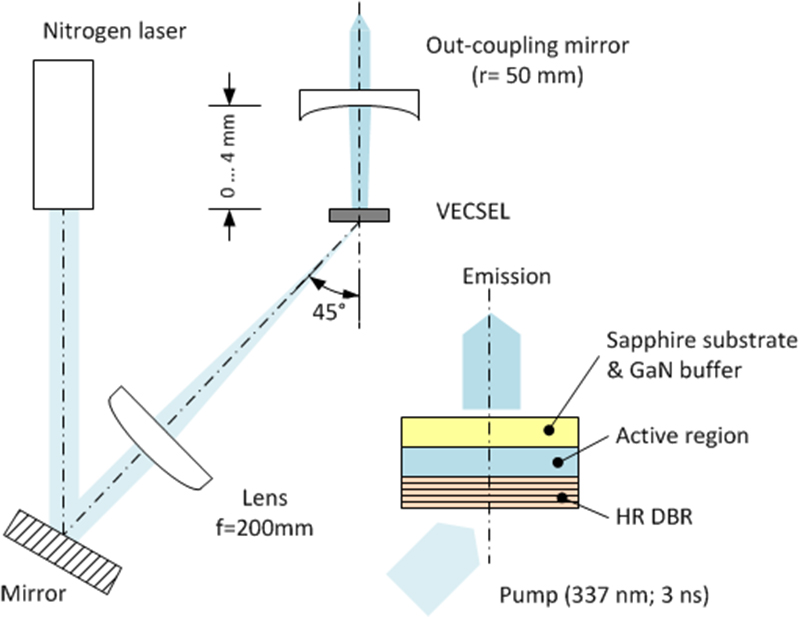In collaboration with TU Berlin and Institut für Strahlwerkzeuge at Universität Stuttgart FBH has succeeded in fabricating InGaN disk lasers. The setup is shown in Fig. 1. Because of the small resonator length of approx. 3 mm the disk laser is pumped through the dielectric mirror (DBR) which enhances the absorption efficiency of the N2 pump laser and simplifies the setup. As shown in Figs. 2 and 3 semiconductor disk lasers with a peak pulse output power of more than 300 W and an emission wavelength of 393 nm could be demonstrated. Meanwhile first semiconductor disk lasers with an emission wavelength of 420 nm have been realized.