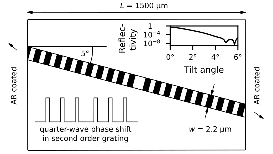 Fig. 1. Schematic top-view of the quarter-wave phase shifted DFB laser with 5° tilted RW and grating. The phase shift is centered in the middle of the cavity. The facets are additionally AR coated. Insets show the outline of the quarter-wave phase shift in the second order grating and the uncoated reflectivity of the facet as function of the tilt angle.