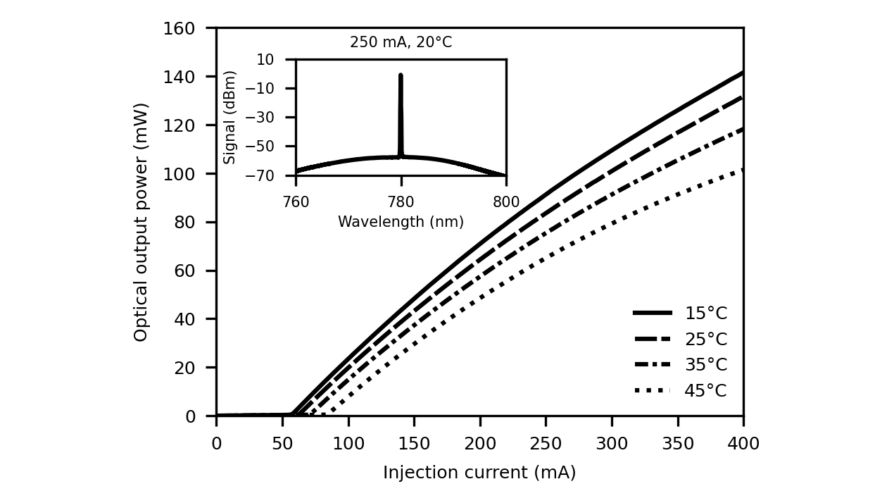 At FBH, we have successfully realized such a DFB laser emitting near 780 nm, a wavelength required for compact frequency references based on rubidium vapor. We achieved this by using FBH's proven buried grating technology based on a two-step epitaxy for fabricating DFB lasers. In order to reduce parasitic reflections from the facets that could deteriorate the spectral behavior, both the ridge waveguide for lateral optical confinement and the grating were tilted with respect to the facets (Fig. 1). The optical power emitted from one facet of a DFB laser with AR-coated facets, as studied here, is naturally lower compared to a DFB laser with a similar epitaxial layer structure grating but one high-reflection facet. Nevertheless, the output power achieved in this case – over 100 mW across a wide temperature range (Fig. 2) – is much higher than what other groups have reported for DFB lasers with a high-reflection coated facet which are known to exhibit mode hops depending on the phase of the grating at that facet. The optical spectrum reveals single-mode operation (inset in Fig. 2). The variation of the side-mode suppression ratio and the peak wavelength with current and temperature shows a mode-hop-free tuning for almost the entire parameter range investigated (Fig. 3).