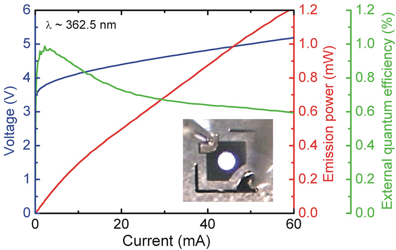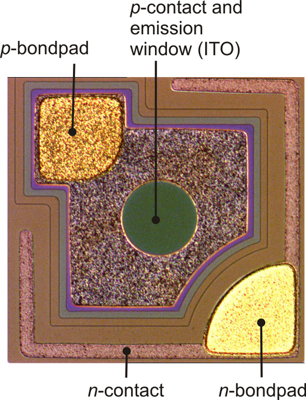 In a first step, top-emitting LEDs have been fabricated which emit through a small area on the chip front side (Fig. 1). The emission is realized by using an optically transparent indium tin oxide (ITO) contact. The area through which the current flows is defined by using either insulating layers or ion implantation. Fig. 2 shows light-current-voltage characteristics of a 360 nm top-emitter LED with a homogeneous emission over a circular aperture of 90 µm in diameter. The optical power is 0.3 W at a diode current of 10 mA. In a next step it is intended to further increase the optical power by optimizing the extraction efficiency. Moreover, procedures to mount lenses on the chip will be developed in order to limit the angle of radiation to 90°.