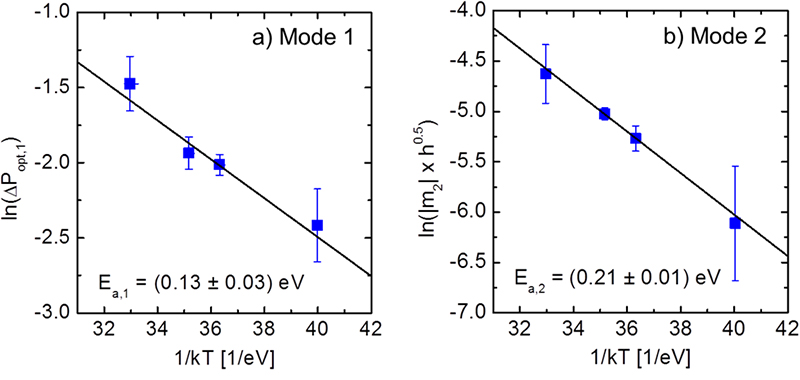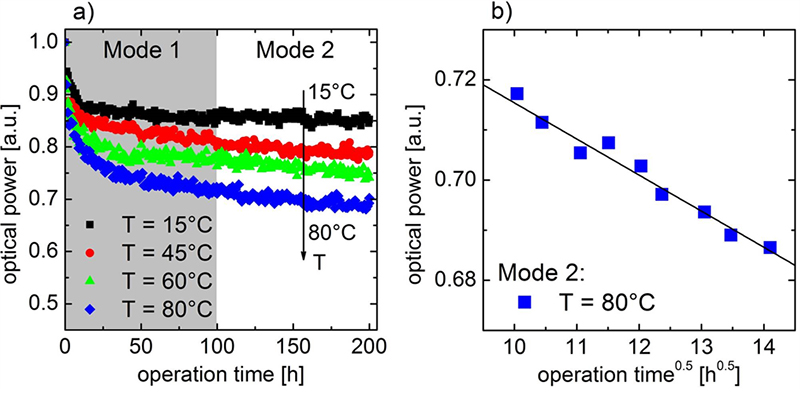 Fig. 1a) shows the temporal evolution of the optical power of UV-B LEDs operated at different temperatures. Commonly, two different degradation modes were observed in all samples: Between 0 h and approximately 100 h of operation the optical power decreases rapidly and levels off, which is called mode 1. Moreover, mode 2 is represented by a slow degradation which dominates for operation times beyond 100 h. The optical power reduction during mode 2 was found to follow a square root time dependence, as can be seen in Fig. 1b). Such dependence is an indication that a diffusion process might be involved in the degradation mechanism. The reduction of the optical power during both degradation modes was accompanied by an increase of the reverse-bias leakage current. In literature, this effect is commonly ascribed to an increase of electrically active point defects in or close to the active region.