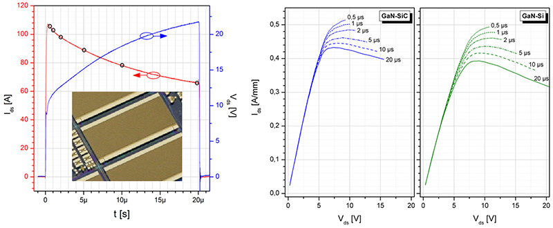 Fig. 1: Pulsed IV characterization of large periphery devices fabricated on SiC and Si substrates; single pulses (l.), I-V characteristics taken for different pulse durations (r.)