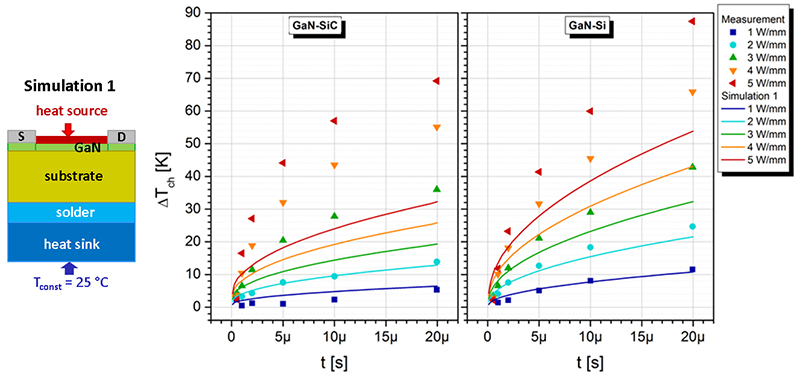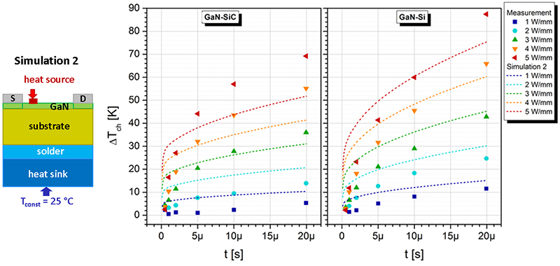 As expected from the differences in thermal conductivity of SiC and Si substrates, devices on Si substrate show a higher channel temperature as compared to GaN-on-SiC devices. This applies if the pulse duration increases and if the device is biased in the saturation region. However, at bias points being typical for power switching (linear region of I-V characteristics) the thermal properties of devices on SiC and Si are fairly comparable. In the linear region, simulation 1 matches very well to the experiment (see Fig. 2, branches with 1 and 2 W/mm). In this case, the assumption of the heat source distribution in the device is valid. The more the device is operated towards the saturation region, the more the heat source shifts to the drain side edge of the gate, which means that for predicting the thermal properties of the saturated device simulation 2 (Fig. 2) becomes valid. Indeed, for the saturated device the now modified heat source distribution provides the better matching to the experiment (see Fig. 3).