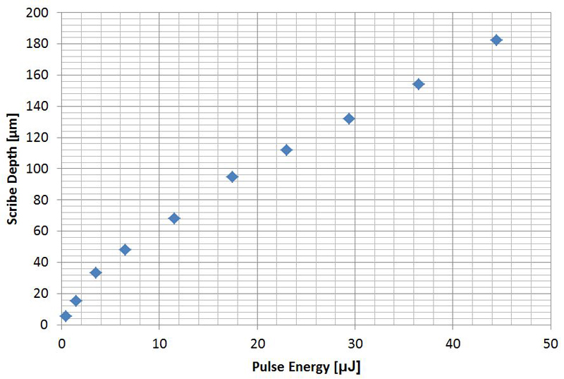 In contrast to conventional scribing by means of a diamond tip, laser scribing does not suffer from abrasion of the tool and the scribe depth can more widely be adjusted according to the needs of the breaking process. The last-mentioned point is illustrated in Fig. 1 that shows the scribe depth as a function of the laser pulse energy. Fig. 2 shows corresponding cross-sections of two laser cuts at different laser pulse energies. The scanning electron micrographs taking before subsequent cleaning still show redeposited material in the trench and near the machined area.