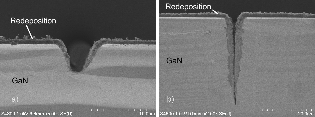 Fig. 2: Cross-sectional scanning electron micrographs of laser scribed trenches in GaN at a scribe speed of 100 mm/min and laser pulse energies of (a) 0.5 µJ and (b) 3.5 µJ yielding to depths of 5 µm and 33 µm, respectively.