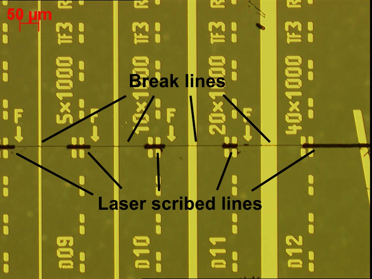 While diamond scribing works excellently for materials with cubic-like crystal structures such as GaAs and silicon, it suffers from low yield when scribing and cleaving rectangular chips of hexagonal GaN-based crystals. A laser scribe line can be placed very flexibly thereby forcing the cleave plane into the desired direction and increasing significantly the yield of the laser dies. As an example Fig. 3 shows a dashed scribe line that guides the breaking along the boundary line of the devices, i.e. the line on the wafer’s front is interrupted near the laser ridge of the diode laser thereby avoiding any damage to the laser facets. To minimize the number of particles on the surfaces caused by redeposited material during laser processing, a water-washable protective coating is applied to the front of the wafer just prior to laser scribing. After processing the coating is washed with room temperature de-ionized water thereby removing particle contamination generated from material ablation.