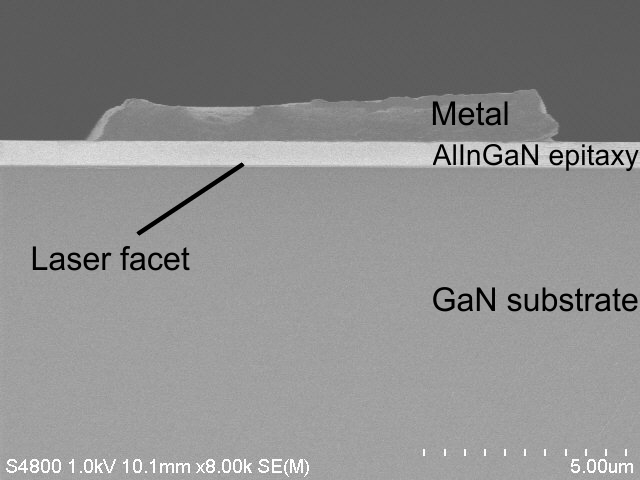 Fig. 4 shows a detailed view of a laser facet after laser-assisted die separation. The facet is free of particle contamination and terraces. When operating the laser diodes there is no indication of degradation of laser performance compared to devices separated by conventional diamond scribing and breaking. However, the laser-assisted process provides more process stability in terms of die yield and the overall processing time is about half of the diamond-based process flow. Further investigations on potential process-induced changes of optical performance and material properties are currently ongoing.