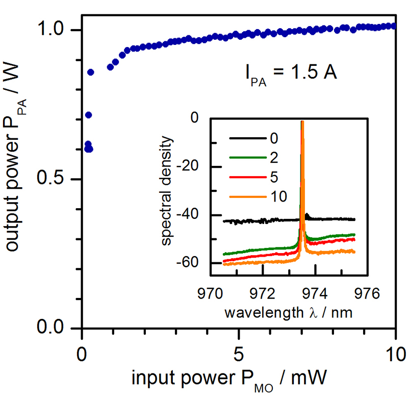 To demonstrate the performance of the RW amplifier, an inhouse-developed 4 mm long DBR laser is used as MO. Fig. 2 shows the dependence of the CW output power of the amplifier on the input power. The RW amplifier is driven at a current of IPA = 1.5 W. At an injection of PMO = 0.2 mW an abrupt increase of the output power PPA of the PA is observed. A further increase of the seed power causes only a small increase of PPA, which approaches a maximum value of PPA = 1 W limited by the current of IPA = 1.5 A injected into the amplifier.