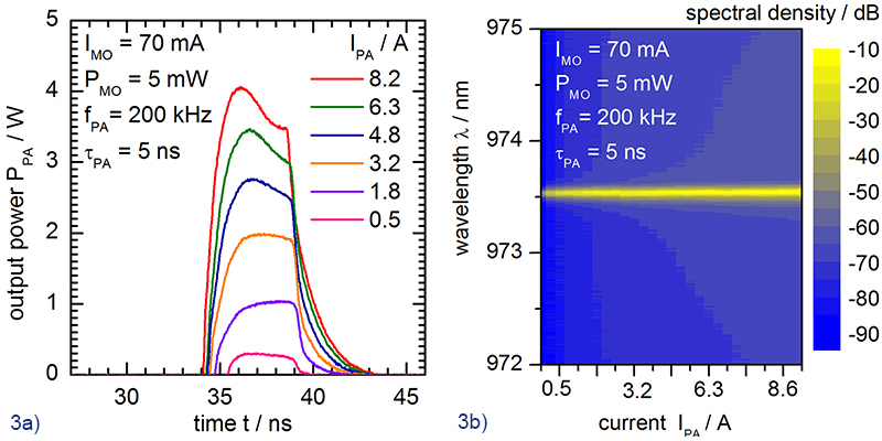 Fig. 3a shows the power that can be achieved when short (5 ns long) current pulses are injected into the amplifier. A peak power of the generated optical pulses of PPA = 4 W is obtained for an amplitude of the current pulses of IPA = 8 A. Compared to directly pulsed diode lasers no relaxation oscillations occur. Additionally, the peak wavelengths of the emitted pulses are independent of the current injected into the amplifier as Fig. 3b reveals. As a result, the spectrum remains very stable. Thus, the combination of a CW operated master oscillator and a CW or pulsed driven power amplifier yields spectrally stable as well as diffraction limited radiation which can be utilized for a large variety of applications.