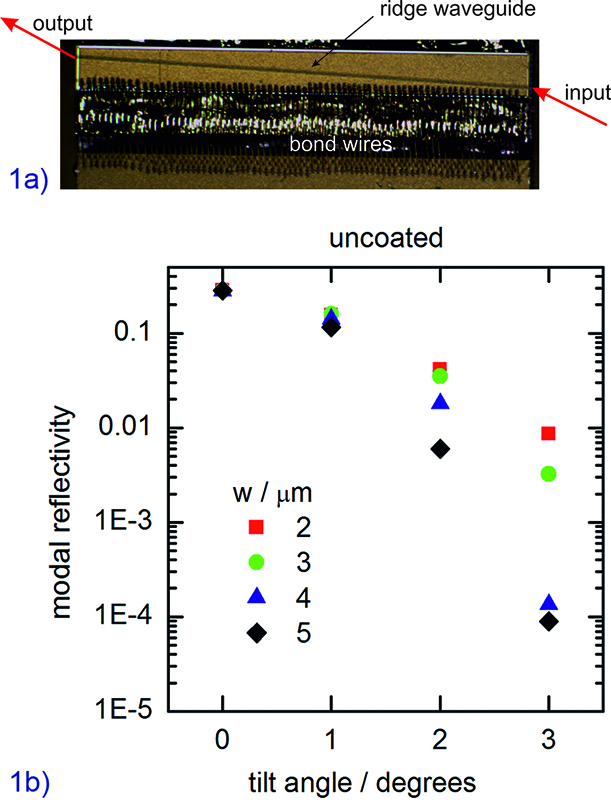 Fig. 1a: Photograph of RW amplifier, 1b: Calculated modal reflectivity vs. tilt angle for different ridge widths