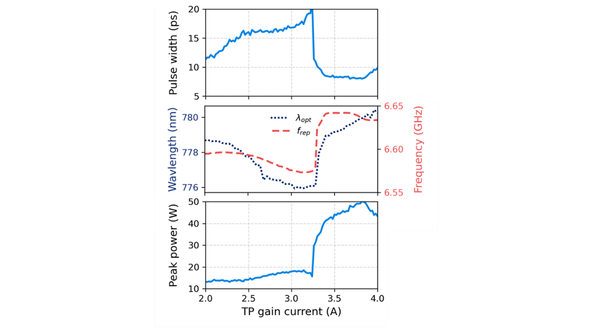 Fig. 2: Mode-locking characteristics of the TP laser: (top) pulse width, (middle) peak wavelength and pulse repetition rate, and (bottom) peak power.