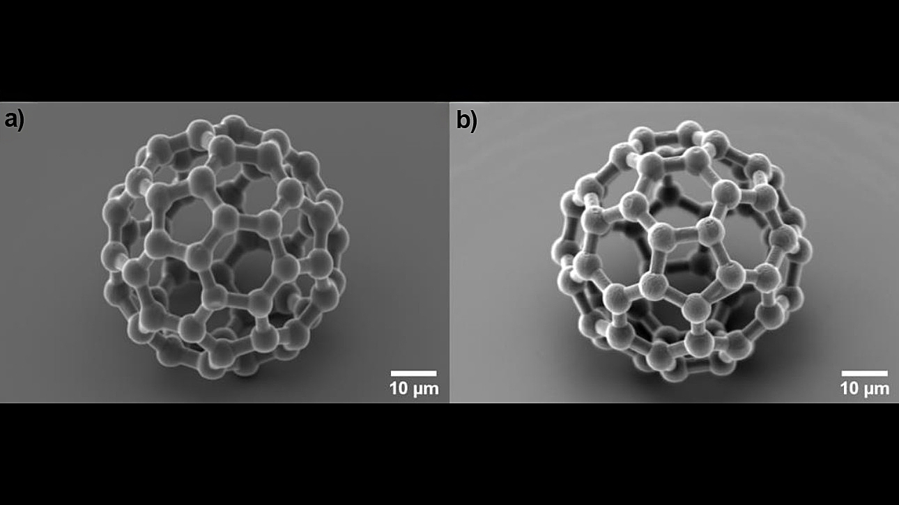 This laser was used to produce, e.g., micro-fullerene balls, as shown in the scanning electron microscope (SEM) picture in Fig. 3. This ball showcases highly detailed 3D structures and the high production quality that can be achieved with our mode-locked TP laser. With results largely comparable to typical Ti:Sa-based 2PP systems, our diode laser outperforms established systems not only in terms of size and weight but also yields improved surface quality in first experiments.
