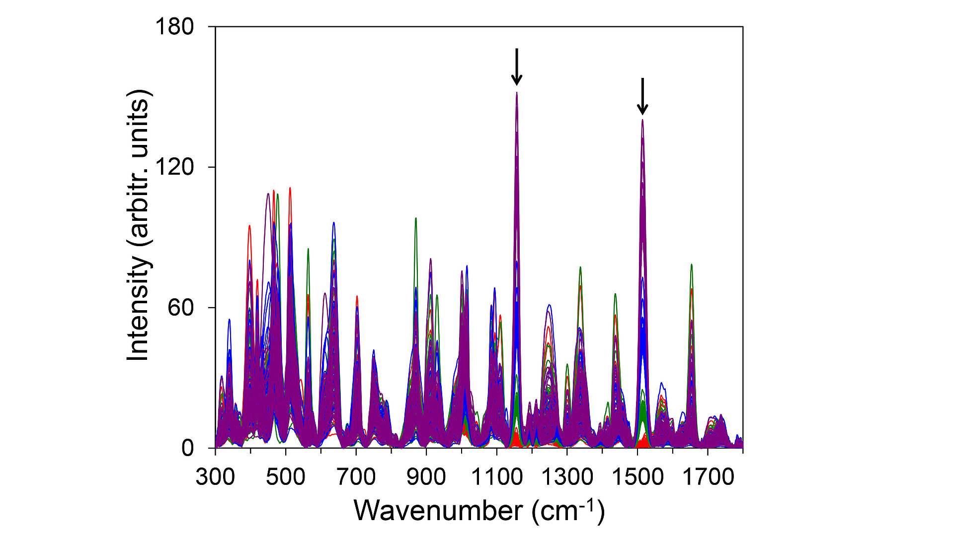 Fig. 1: Plot of randomly chosen Raman spectra containing 50 spectra from each of the four classes. Line colors represent individual classes: red (class 0), green (class 1), blue (class 2), and purple (class 3). Arrows indicate two strongest Raman signals of the target substance beta-carotene.