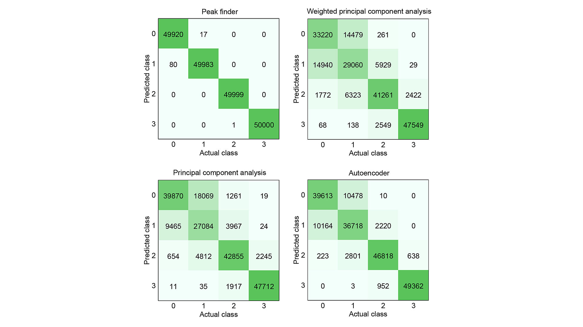 To assess the performance of the peak finder approach, we compared it with three frequently applied state-of-the-art methods for feature reduction: autoencoder, PCA, and weighted PCA (WPCA). The corresponding confusion matrices, which relate actual class membership to predicted class assignment, are shown in Fig. 2. Using the peak finder, the number of incorrectly classified samples – particularly between adjacent classes – is significantly reduced compared to the other methods. Overall, the fraction of correctly classified samples is 99.9 % for the peak finder, compared to 86.3 % for the autoencoder, 78.8 % for PCA, and 75.6 % for WPCA.