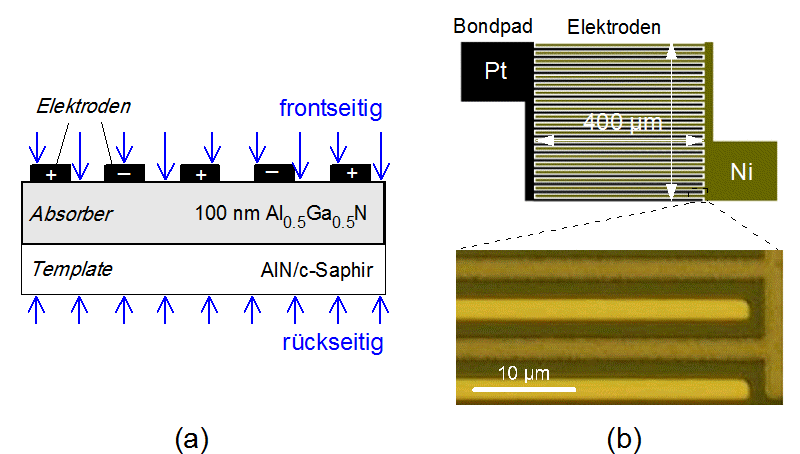 Abb. 1: Aufbau eines a-MSM-Fotodetektors, a) Querschnitt der Epitaxiestruktur mit gleichen Elektroden auf der Absorberoberfläche (MSM) mit front- bzw. rückseitigem Bestrahlungsmodus (Pfeile). b) Schematische Draufsicht der Detektorgeometrie des Fotodetektors (o.). Die lichtmikroskopische Vergrößerung (u.) zeigt die ineinandergreifenden Elektrodenkämme mit Pt- bzw. Ni-basierter Metallisierung.